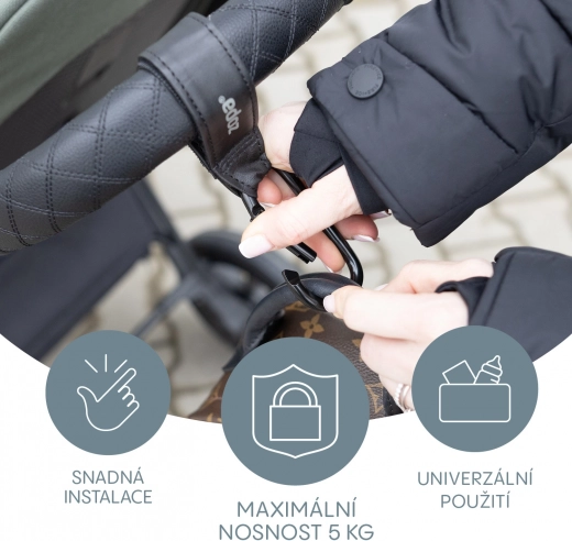 Cureaua multifuncțională cu carabină Deluxe este o soluție ideală pentru părinți și cumpărători care doresc mâini libere. Datorită instalării ușoare cu velcro fixează ferm geanta de schimb, poșeta sau geanta de cumpărături pe mânerul căruciorului.