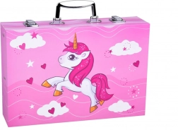 Valiza cu un design jucăuș de unicorn, ușor de transportat datorită mânerului metalic.