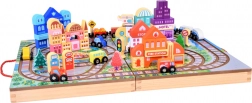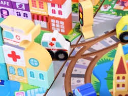Include blocuri de lemn colorate pentru construirea unui oras, care incurajeaza creativitatea si constientizarea in timpul constructiei.