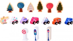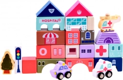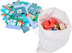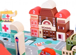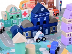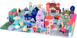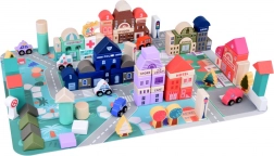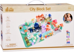 Acest set pastel include 115 piese diverse din lemn incluzând clădiri, vehicule, arbori și semne de circulație. Copiii pot construi propriul oraș cu o școală, spital, bancă și stație de poliție. Cu acest set constructiv, nu doar își dezvoltă imaginația, ci și abilitățile motorii.