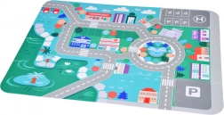 Covorașul prezintă peisajul urban cu drumuri și parcări marcate, încurajând copiii să se joace educativ cu vehiculele.