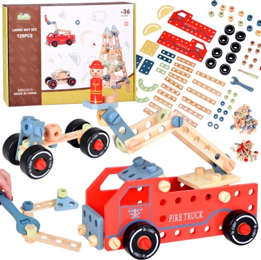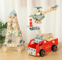 Intrați în lumea creativității cu setul nostru de construcție din lemn, care susține dezvoltarea aptitudinilor cheie la copii. Acest set educațional permite crearea de diverse modele, precum autospeciale de pompieri, avioane și alte forme creative.