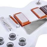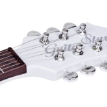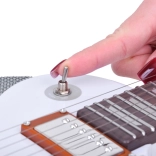 - Design realist: formă clasică de chitară electrică, elemente și potențiometre cromate.
