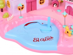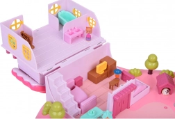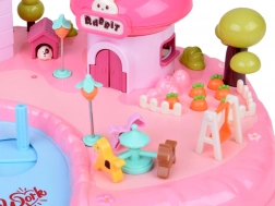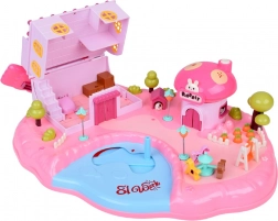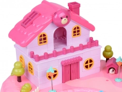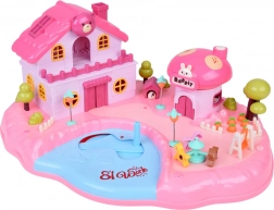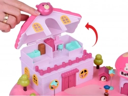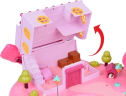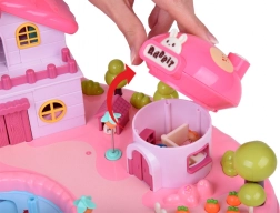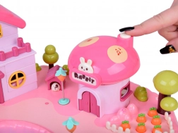 Căsuța oferă un interior pe mai multe niveluri cu scene pentru joaca zilnică: dormitor cozy cu pat, dulap cu uși, baie cu cadă și chiuvetă, bucătărie cu frigider și măsuță de toaletă. Efectele luminoase și sonore activate prin butoane intensifică atmosfera, iar inscripția iluminată RABBIT reacționează în ritmul melodiei.