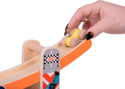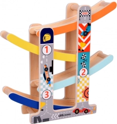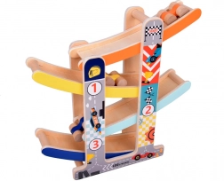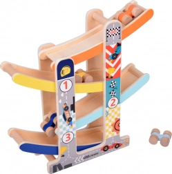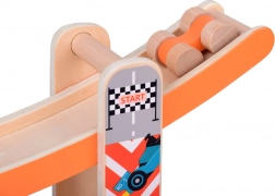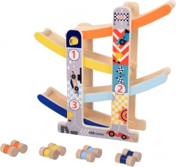 Această pistă robustă din lemn pentru mașinuțe oferă copiilor atât distracție, cât și învățare. Datorită celor patru piste colorate și celor patru mașinuțe din lemn, copiii se bucură de coborâri dinamice și exersează în același timp motricitatea fină, coordonarea mână–ochi și relația cauză–efect. Jucăria este gata de utilizare imediat după despachetare – fără asamblare.