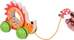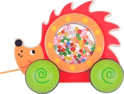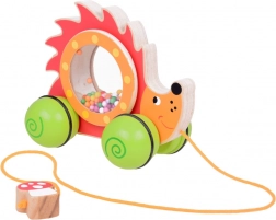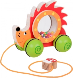 Drăgălașul arici din lemn pe roți, cu un tambur transparent plin cu biluțe, este partenerul perfect pentru primii pași. La tras, biluțele din burtică se rotesc vesel și zornăie, motivând copilul să se miște. Jucăria are construcție stabilă, culori netoxice și șnur practic cu burete otrăvitor pentru o tragere ușoară.