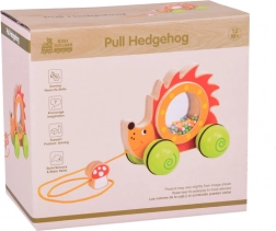 Datorită ecartamentului lat al roților, ariciul este stabil și ușor de controlat. Jucăria este realizată din lemn rezistent și este vopsită cu culori sigure, netoxice, potrivită și pentru cei mai mici exploratori. Șnurul portocaliu cu burete otrăvitor din lemn facilitează prinderea și tragerea.