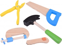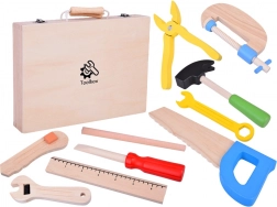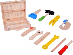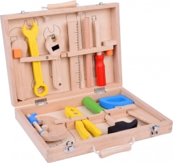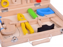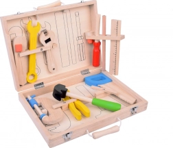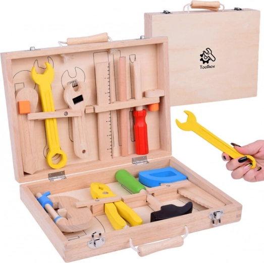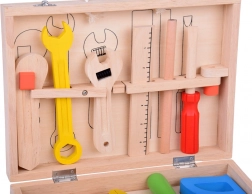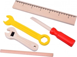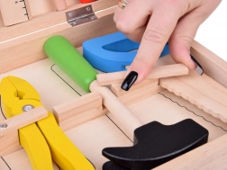 Acest set de unelte din lemn este conceput să se potrivească perfect mâinilor mici și să îi motiveze pe copii să descopere activ lumea reparațiilor și a creației. Datorită formelor realiste, dar sigure, copiii se familiarizează jucându-se cu modul de funcționare al ciocanului, fierăstrăului, șurubelniței sau cheilor.