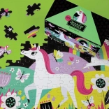 Descoperă magia asamblării cu motivul unicorni, care după stingerea luminilor strălucește în întuneric. Puzzle de calitate cu 100 de piese din hârtie reciclată oferă decupaj precis, finisaj mat pentru culori fidele și vopsele netoxice. În pachet găsești și imagine-ghid și o cutie rezistentă din carton reciclat.