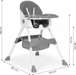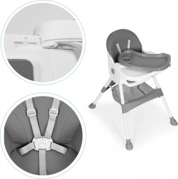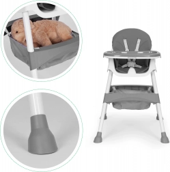 Siguranța este asigurată de centura în 5 puncte și picioarele metalice stabile cu capete antiderapante. Tava dublu-strat detașabilă are margini ridicate și suport pentru pahar, iar stratul superior se poate spăla în mașina de spălat vase. Structura pliabilă economisește spațiu, iar coșul de sub șezut păstrează bavetele, șervețelele și jucăriile mereu la îndemână.
