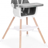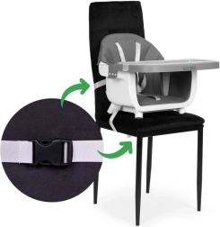 Varianta 2 în 1 permite demontarea picioarelor și fixarea sigură a șezutului cu chingi pe un scaun obișnuit – ideal în călătorii sau la masa din sufragerie.