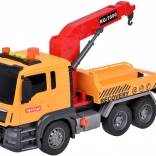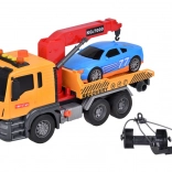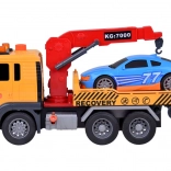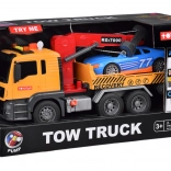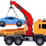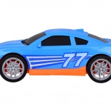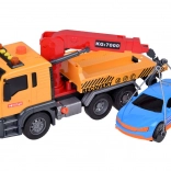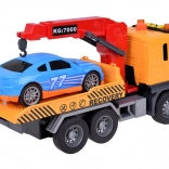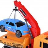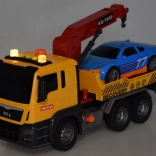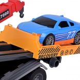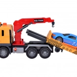 Setul include și o mașină sport albastră care se potrivește perfect pe vehiculul de tractare. Întreaga jucărie este realizată în culori realiste - galben, gri, roșu și albastru.