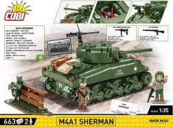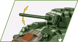 Setul include elemente funcționale: șasiu pe șenile, turelă rotativă, țeavă mobilă, trapă a comandantului deschizabilă și capac de service cu machetă de motor. În pachet găsești două figurine – un tanchist american cu căști telefonice și pistol-mitralieră M3 „Grease Gun” și un infanterist cu pușcă M1 Garand – plus accesorii de decor, inclusiv un segment de gard și gard viu.