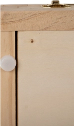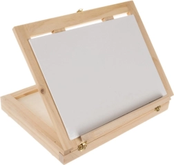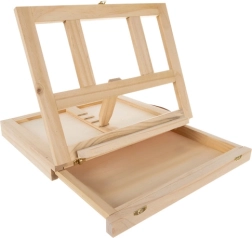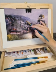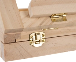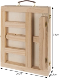 Geanta din lemn este dotată cu un sertar și un șevalet, asigurând transportul ușor și organizarea materialelor artistice.