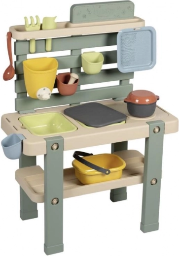 Această bucătărie de exterior durabilă, în culori naturale, oferă copiilor un spațiu autentic pentru joacă și experimentare cu apă, nisip și materiale naturale. Cutii detașabile pentru manipulare și curățenie ușoară, iar robinetul cu închidere rotativă ajută la dozarea apei și dezvoltă motricitatea fină.