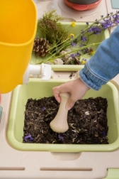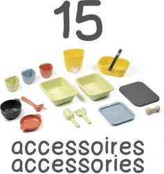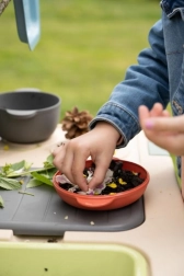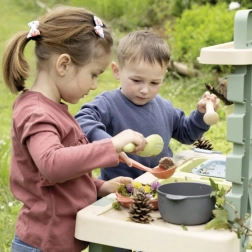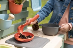 Sită, coșuleț, polonic, greblă, lopățică și alte accesorii inspiră gătitul din noroi, nisip și flori și încurajează jocul împreună.