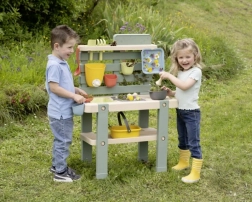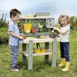Această bucătărie de exterior durabilă, în culori naturale, oferă copiilor un spațiu autentic pentru joacă și experimentare cu apă, nisip și materiale naturale. Cutii detașabile pentru manipulare și curățenie ușoară, iar robinetul cu închidere rotativă ajută la dozarea apei și dezvoltă motricitatea fină.