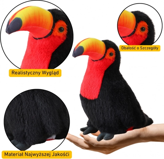 Tucanul de pluș redă fidel coloritul caracteristic, negru, cu accente roșii și cu un cioc proeminent. Datorită materialului fin și catifelat, oferă confort maxim la îmbrățișare și va deveni partenerul preferat atât pentru joacă, cât și pentru relaxare.