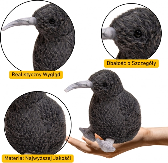 Această mascotă kiwi de pluș, în eleganta culoare neagră, impresionează prin realizarea realistă și suprafața catifelată, care te îmbie la alint. Datorită detaliilor lucrate cu grijă – ciocului lung, picioarelor delicate și texturii pufoase – are un aspect foarte verosimil și va deveni companionul preferat pentru copiii de la 3 ani în sus.