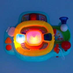 Volanul stilat pentru cei mici are un panou clar cu o mică mașinuță, butoane și manete care îi invită pe copii să descopere. Efectele sonore și luminoase imită fidel condusul real, iar distracția este completată de melodii vesele. Părinții vor aprecia posibilitatea de reglare a volumului.