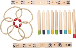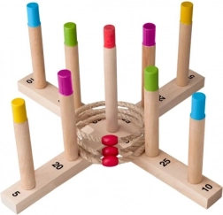 Experimentează distracția cu jocul de aruncat inele din lemn. Scopul este de a arunca cinci inele din frânghie țesută pe o cruce din lemn cu bețișoare și să acumulezi cât mai multe puncte. Acest joc este minunat pentru dezvoltarea dexterității, răbdării și concentrației. Jocul include:
