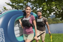În pachet găsiți tot ce aveți nevoie: vâsle din două piese, pompă manuală și petic de reparare – doar despachetați și porniți.