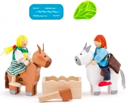 Setul include două figurine, doi cai și o lădiță din lemn cu legume. Copiii pot crea imediat povești de la fermă, de pe hipodrom sau despre transportul animalelor.