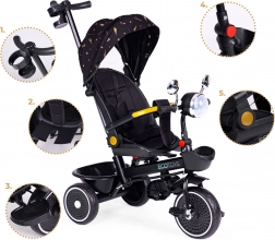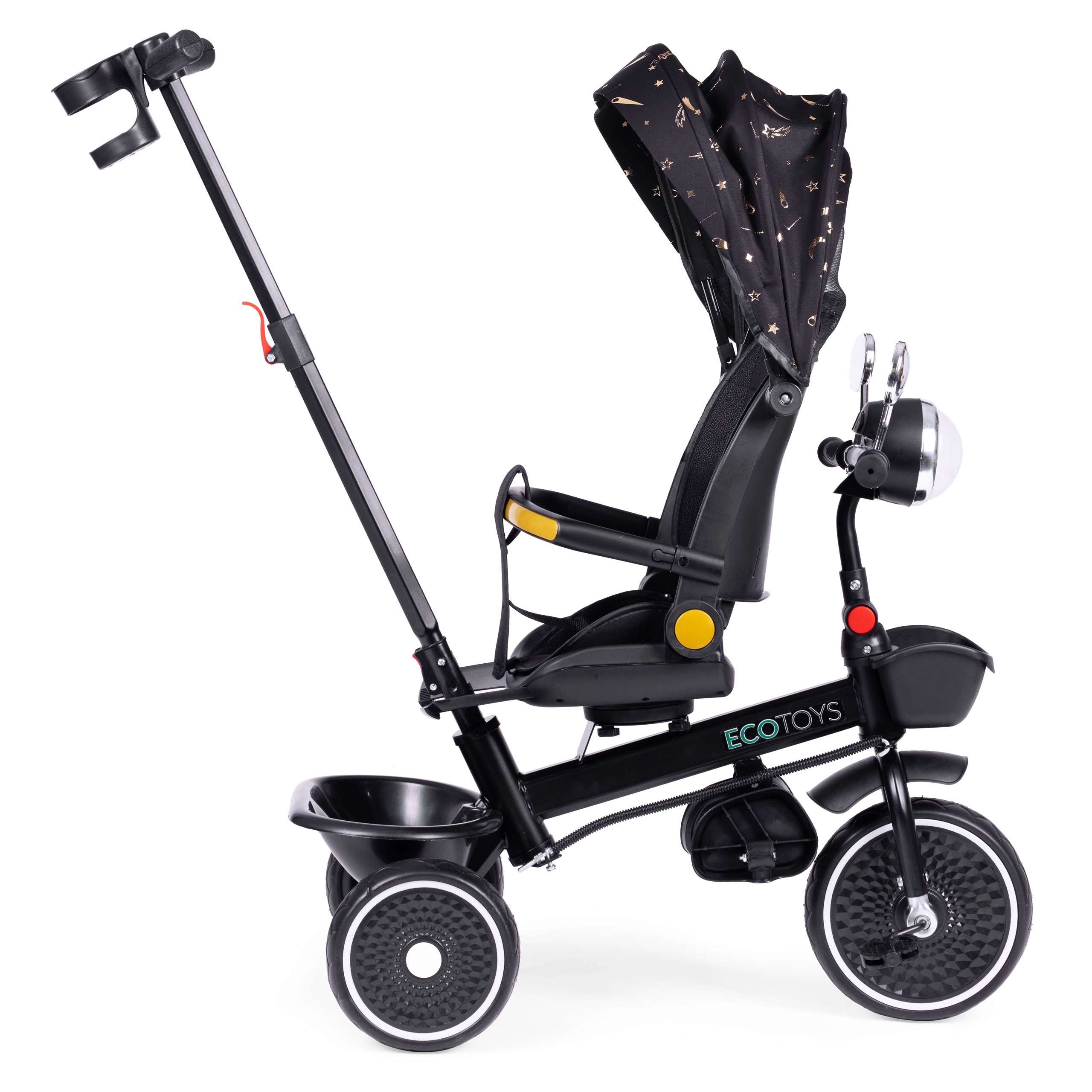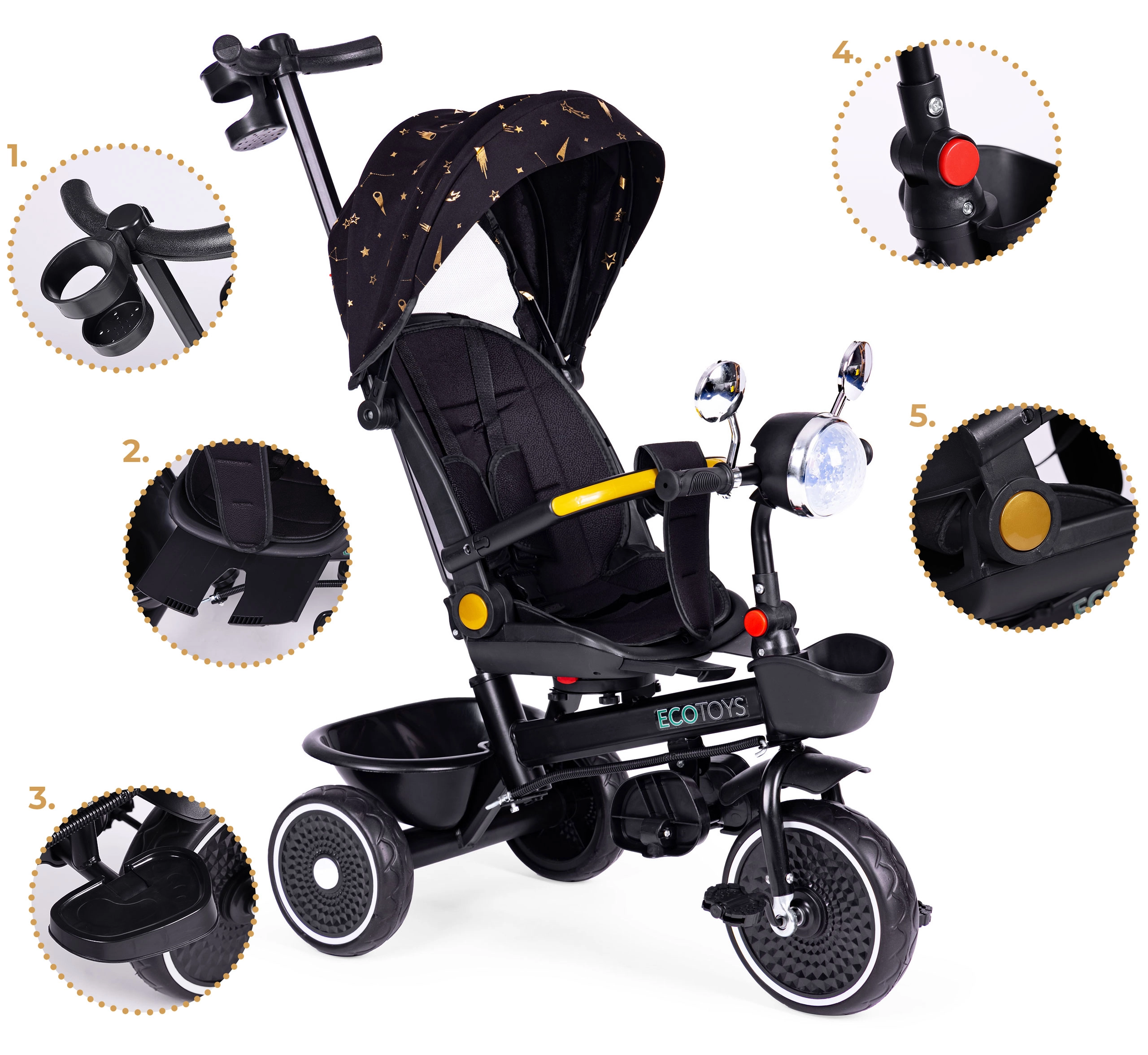 Tricicleta multifuncțională pentru copii ECOTOYS crește odată cu copilul tău de la 6 luni la 6 ani. Oferă scaun rotativ 360°, tijă de ghidare pentru părinți, copertină pliabilă și centuri de siguranță și bare de protecție. Datorită construcției rezistente din oțel, roților EVA și accesoriilor practice (lumină cu melodii, suport pentru băuturi, coșuri de depozitare) asigură confort, siguranță și distracție la fiecare plimbare.