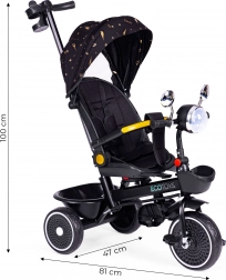 Această tricicletă inteligentă combină un cărucior și un ride-on într-un singur produs. Scaunul rotativ permite mersul orientat spre părinte sau în direcția de deplasare, spătarul reglabil și copertina pliabilă cu plasă de aerisire oferă protecție și confort sporit. Direcția parentala rotește direct ghidonul, astfel încât ai direcția și ritmul sub control.