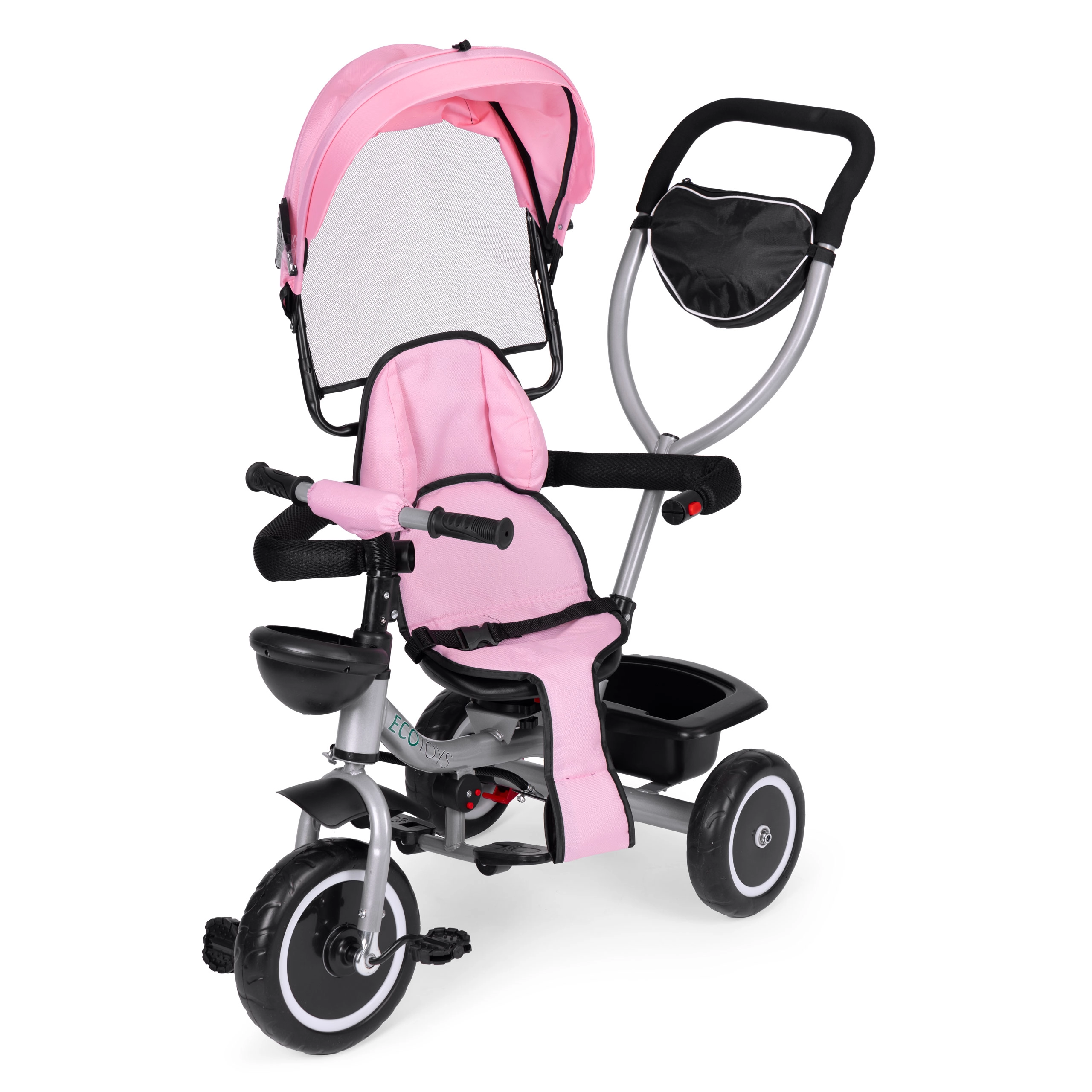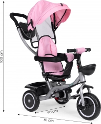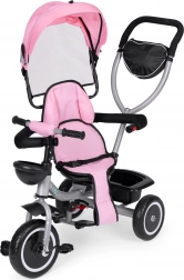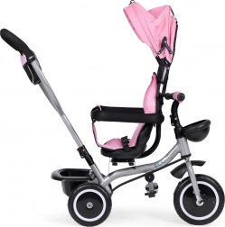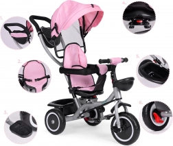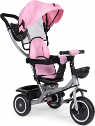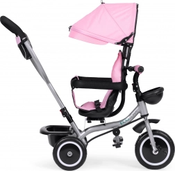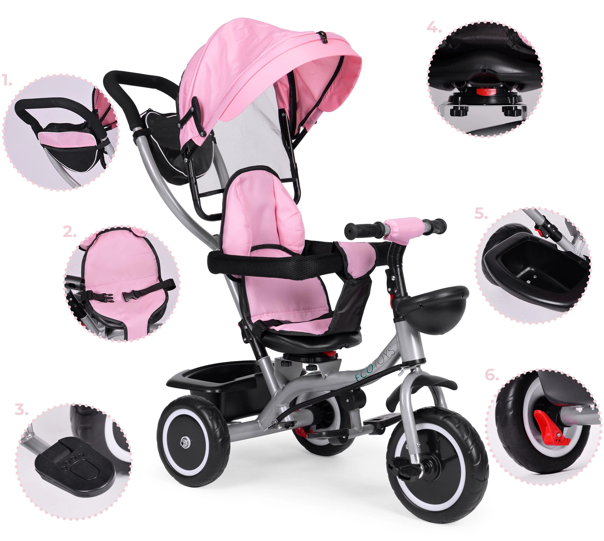 Această tricicletă multifuncțională combină confortul unui cărucior cu bucuria primelor plimbări pe bicicletă. Datorită scaunului rotativ, copilul poate sta cu fața către părinte sau în direcția de mers. Copertina pliabilă protejează de soare, vânt și ploaie ușoară, iar mânerul de ghidare pentru părinte asigură control deplin asupra direcției.