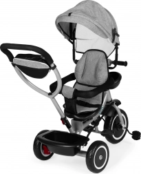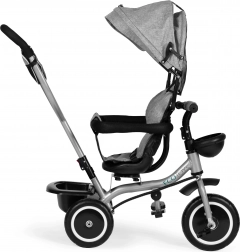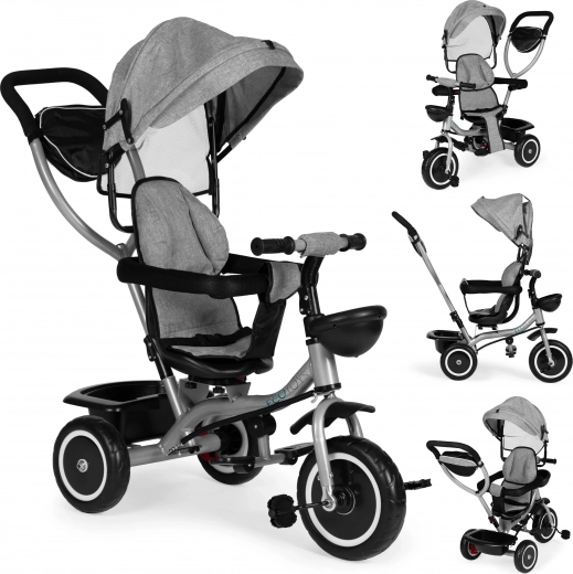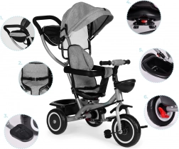 Tricicleta ECOTOYS crește odată cu copilul tău – de la primele plimbări cu control parental până la pedalatul independent. Scaunul rotativ permite poziționarea cu fața la părinte sau în direcția de mers, copertina pliabilă protejează de soare și vânt, iar centura în 5 puncte cu bară frontală oferă siguranță pe orice suprafață.