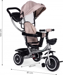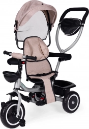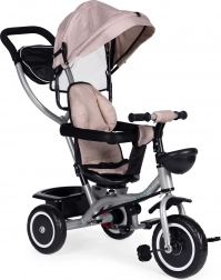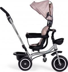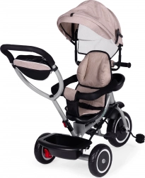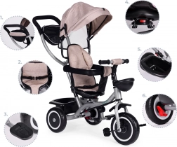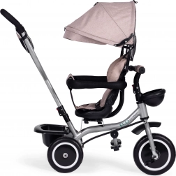 Tricicleta ECOTOYS combină căruciorul și vehiculul de împins într-un singur produs. Datorită scaunului rotativ, copilul poate fi transportat cu fața spre părinte sau în sensul de mers. Mânerul pentru părinte este conectat la ghidon, astfel încât ai direcția complet sub control, în timp ce copilul se odihnește pe scărițele pliabile.