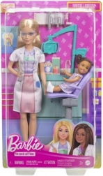 Joacă-te de-a dentistul cu Barbie și pacientul ei. Setul include halat alb, instrumente dentare și scaun stomatologic.