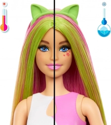 Datorită efectului special de schimbare a culorii pe fața păpușii (apă rece/caldă), look-ul se poate transforma magic iar și iar. Părul lung roz‑verde, bentița cu urechi de pisică și pantofii statement creează un stil inconfundabil pentru orice aventură fashion.