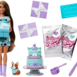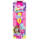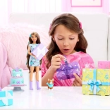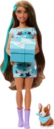 Descoperă cine se ascunde înăuntru! Această variantă include o BARBIE brunetă cu șuvițe turcoaz, o rochie sclipitoare cu stele mov și pantofi mov asortați. Setul include și un corgi adorabil cu bandană – invitatul de onoare al oricărei petreceri de aniversare.