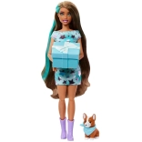 BARBIE cu păr lung și șuvițe turcoaz, rochie sclipitoare cu stele mov și pantofi la modă. Include și un cățel adorabil cu bandană.