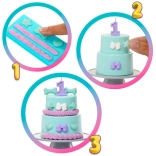 Modelează un tort cu două etaje din pastă, decorează cu ajutorul formelor și uneltelor. Apa rece/caldă dezvăluie detalii speciale de petrecere pe fața păpușii.
