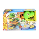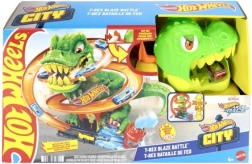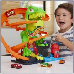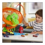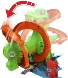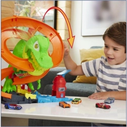 Pregătește-te pentru o cursă palpitantă în Hot Wheels City! Lansează mașinuța metalică inclusă, la scară 1:64, și treci pe lângă T‑rex. De fiecare dată când mașina trece, ochii dinozaurului se rotesc, până când în cele din urmă este doborât. Copiii pot încerca scenarii variate – de la alimentare rapidă până la o victorie eroică ce salvează întregul oraș.