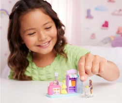 Mini păpușa BARBIE (cca 3,5 cm) se îndoaie în talie, poate sta jos sau se poate apleca spre tejghea și stă pe un suport în formă de inimă, care se potrivește cu alte căsuțe, vehicule și seturi din seria MINI BARBIE LAND. Joaca dezvoltă în mod natural imaginația, motricitatea fină și abilitățile sociale.