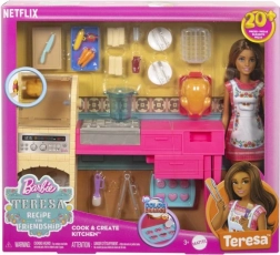 Acest set de bucătărie fermecător cu păpușa Teresa aduce copiilor gătitul realist la scara BARBIE. Datorită dotărilor bogate și elementelor interactive, precum cuptorul funcțional cu selector rotativ și „coacerea” biscuiților cu efect de schimbare a culorii, prind viață scenarii distractive de la pregătirea aluatului până la servire.