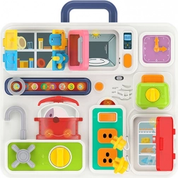 Tabla de bucătărie interactivă Huanger este echipată cu funcții precum un frigider deschis, aragaz cu robinete, cuptor cu microunde cu temporizator și contacte pentru conectarea aparatelor. Aceste elemente oferă divertisment nelimitat și stimulează dezvoltarea senzorială a copilului. Jucăria permite copiilor să joace scenarii realiste precum spălatul produselor, păstrarea lor în frigider și încălzirea în cuptorul cu microunde.