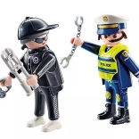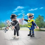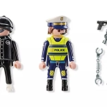 Acest set captivant de la PLAYMOBIL conține figurinele Policeman și Hoț. Polițistul, echipat cu pistol și cătușe, este pregătit să prindă infractorul în flagrant delict.