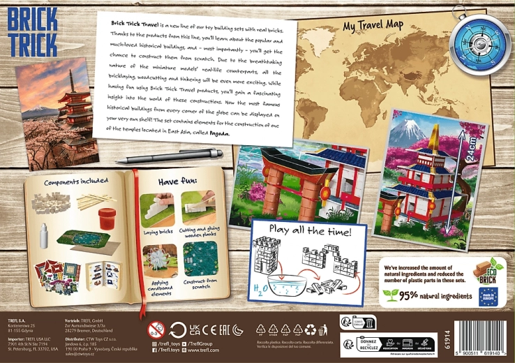 Îți poți anima construcția finalizată cu figurine din hârtie și decorațiuni. Dacă îmbini mai multe seturi TREFL BRICK TRICK, vei crea o scenografie impresionantă – de la un sătuc pitoresc la un oraș modern sau o așezare medievală. Adezivul este solubil în apă, astfel setul este reutilizabil.