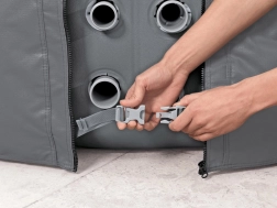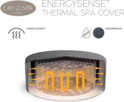 Montajul este rapid și intuitiv. Cureaua circumferențială ajustabilă cu cleme de siguranță asigură o fixare fermă, în timp ce fermoarul integrat permite conectarea fără probleme la pompă fără a fi nevoie să scoateți husa. Husa este compatibilă cu modelele Lay‑Z‑Spa St. Moritz, Monaco, Santorini HydroJet Pro și alte căzi rotunde cu diametrul de 216 cm.