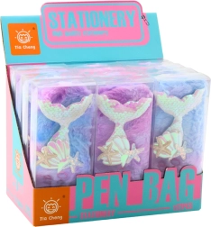 Penar de pluș cu sirenă, ideal pentru copiii care iubesc marea și misterele ei. Combinația de culori pastelate delicate, coadă albă cu paiete și scoici creează un accesoriu unic pentru rechizitele școlare.
