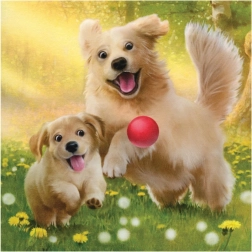 Ilustrațiile cu căței jucăuși pe pajiște îi motivează pe copii să asambleze și le dezvoltă imaginația.