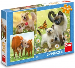Acest set conține trei puzzle-uri separate a câte 55 de piese, care îi vor captiva pe copii prin ilustrațiile vesele cu căței, pisici și alte animăluțe. Datorită cartonului solid, puzzle-urile sunt suficient de rezistente chiar și pentru asamblări frecvente și se prind ușor.