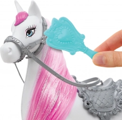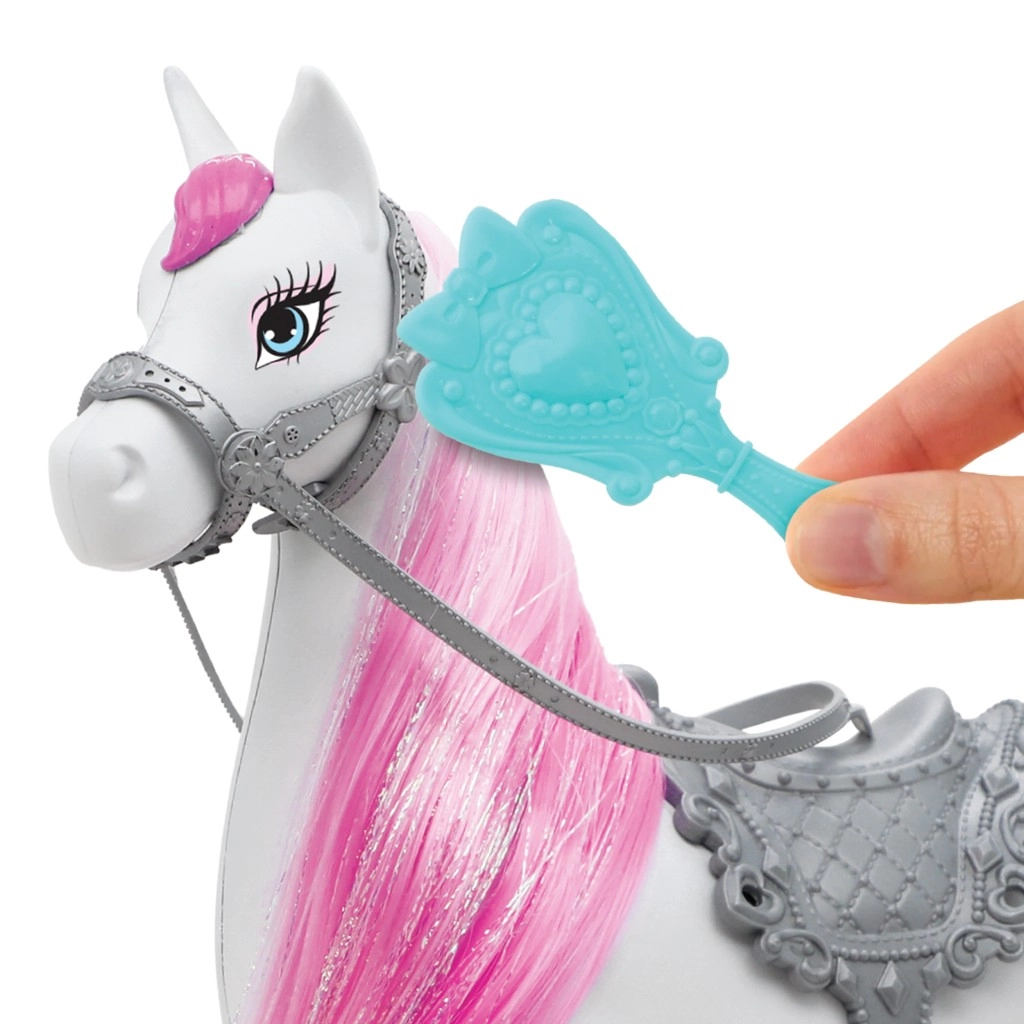 Căluțul alb cu coamă roz și șa argintie îi permite prințesei să pornească în plimbări spre tărâmul imaginației.