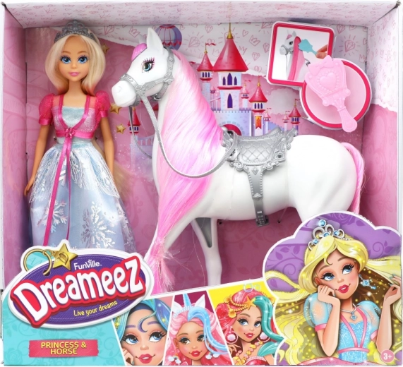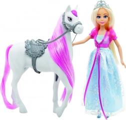 Păpușa are aproximativ 29 cm înălțime, poartă coroniță și o rochie decorată în detaliu, iar căluțul este echipat cu șa și zăbală. Datorită accesoriilor, joaca devine și mai realistă și distractivă – de la plimbări până la îngrijirea coamei.