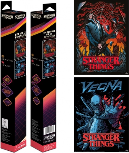 Acest set conține două postere diferite, cu dimensiuni de 38×52 cm. Ideal pentru fanii Stranger Things care doresc să își decoreze camera sau biroul cu motive stilate.